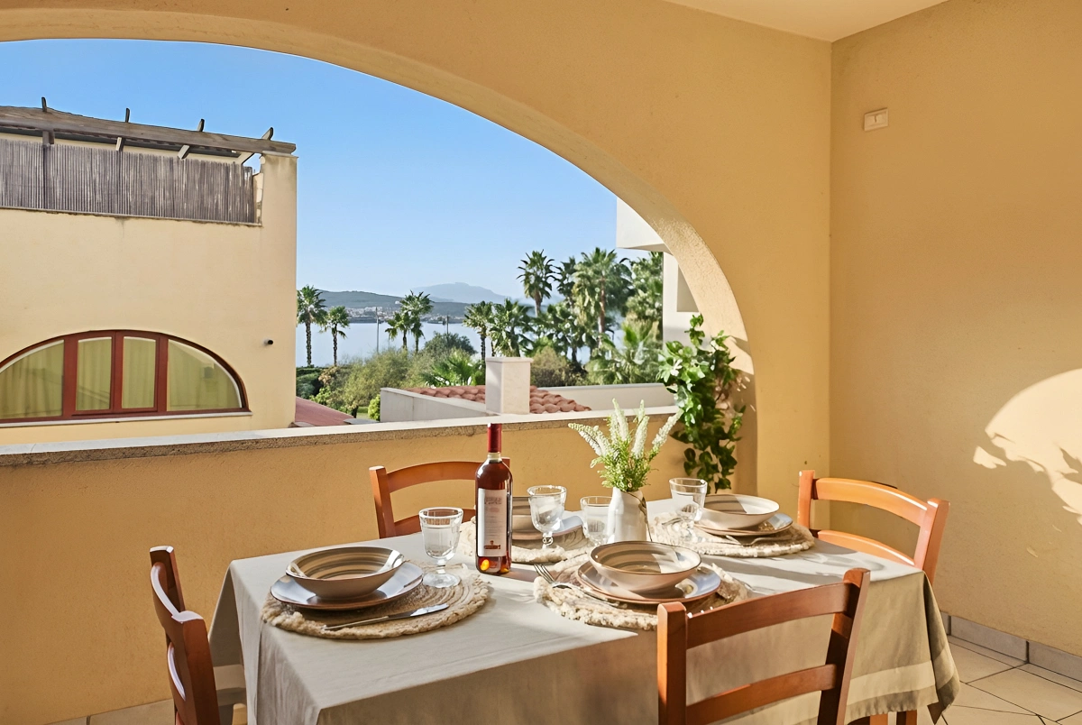 Sì, la terrazza offre una splendida vista mare sulle acque del golfo. La sua caratteristica distintiva è l’essere una loggia coperta, che garantisce ombra e protezione, permettendovi di pranzare o rilassarvi all’esterno in qualsiasi momento della giornata.