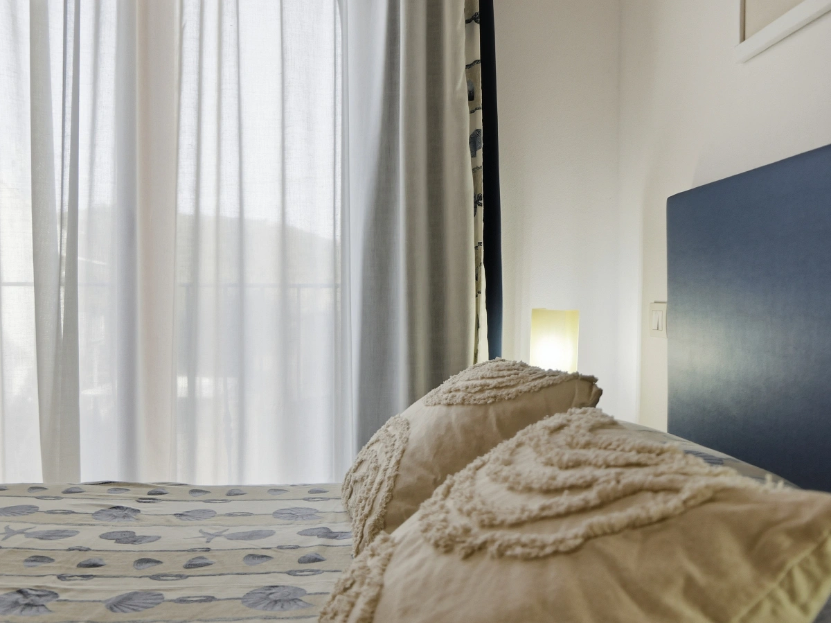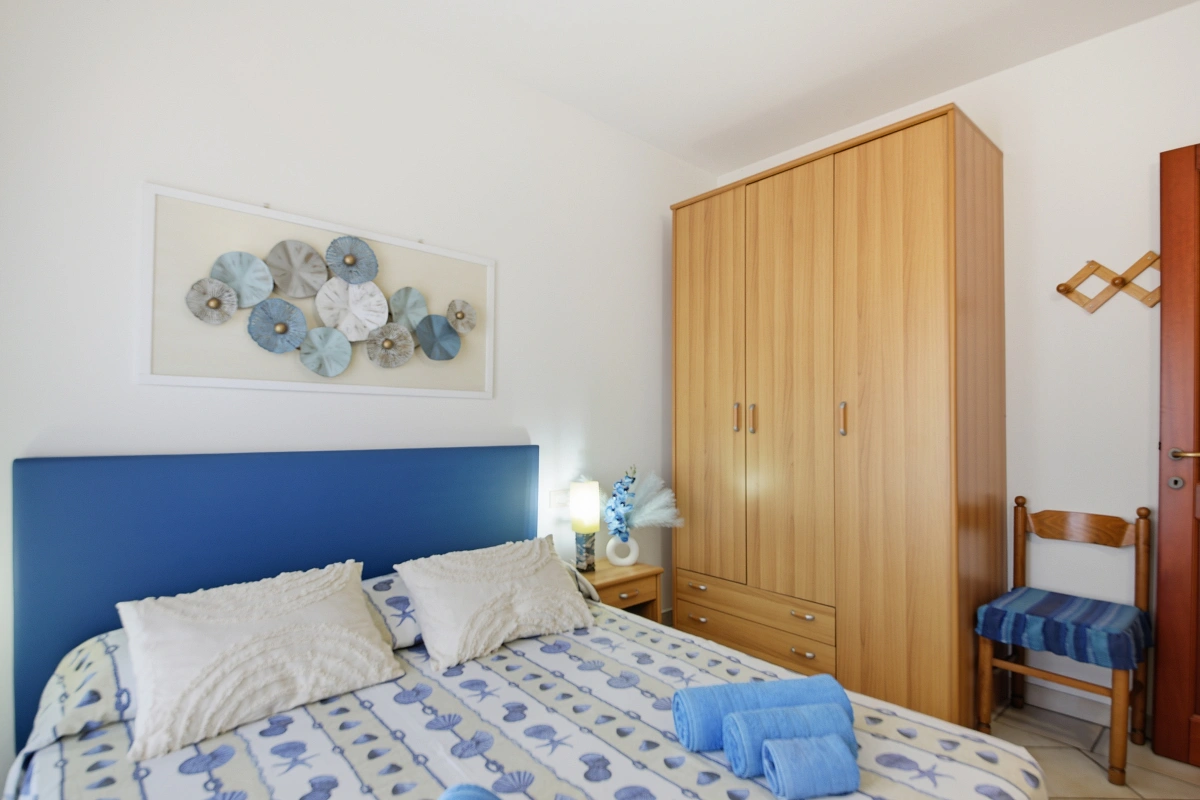 Camera Matrimoniale: La camera da letto principale è accogliente e silenziosa, con un letto matrimoniale, testiera imbottita e biancheria a tema marino che invita al riposo.