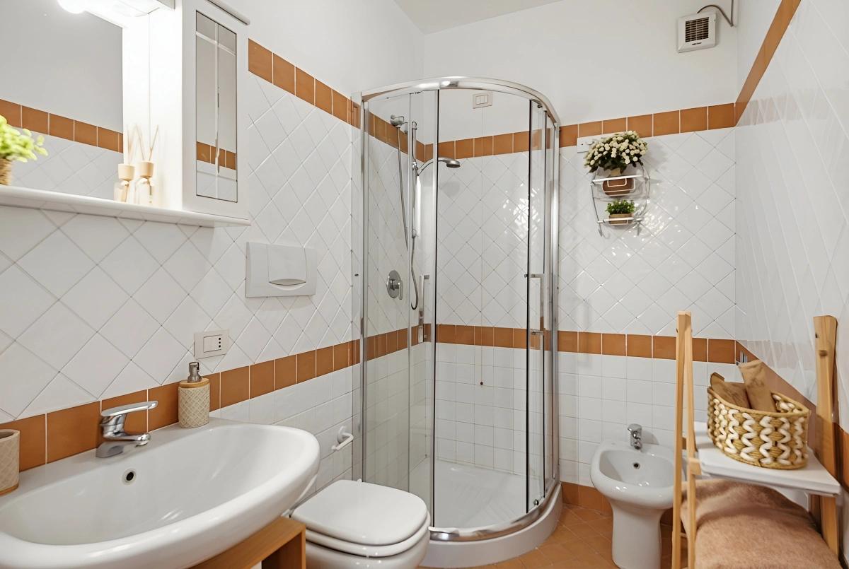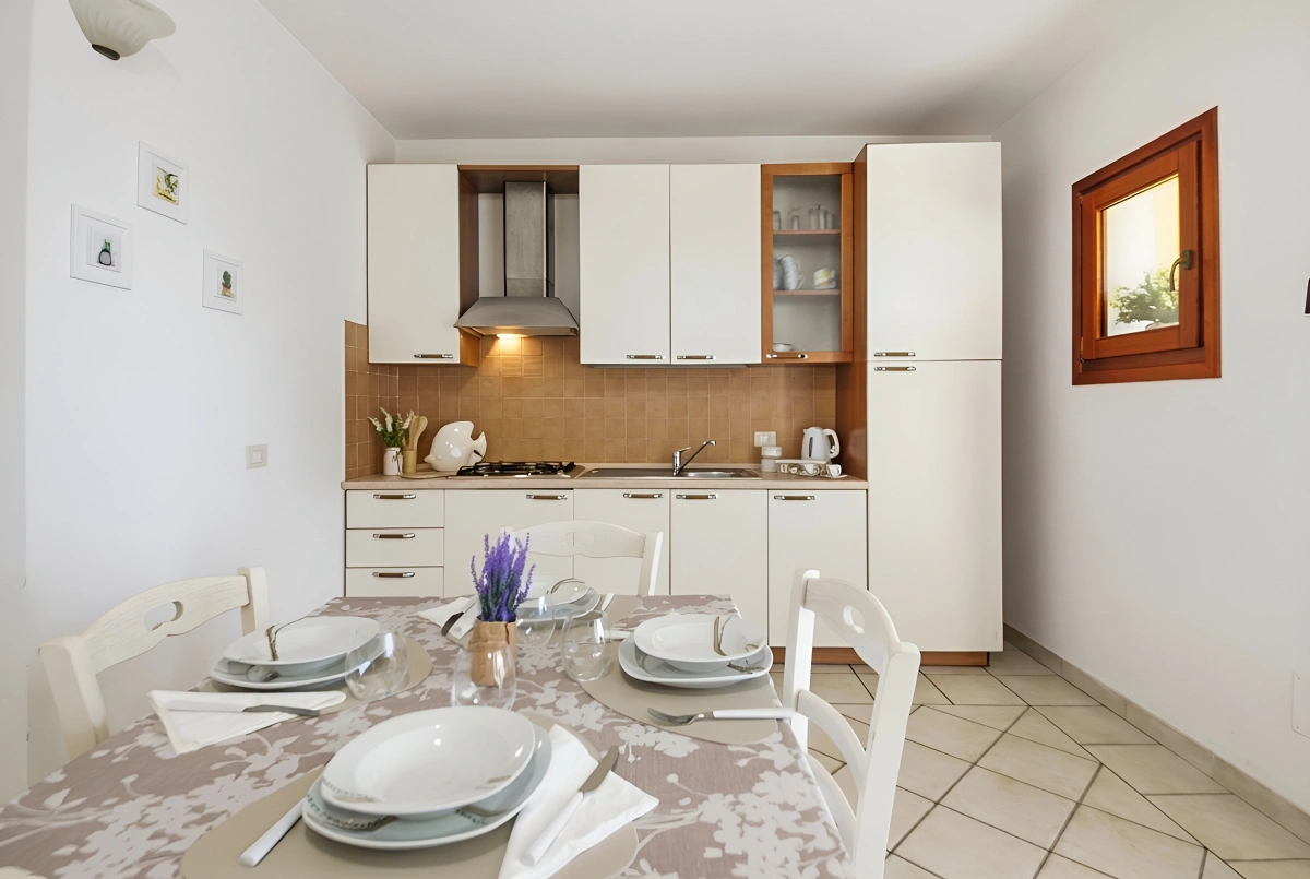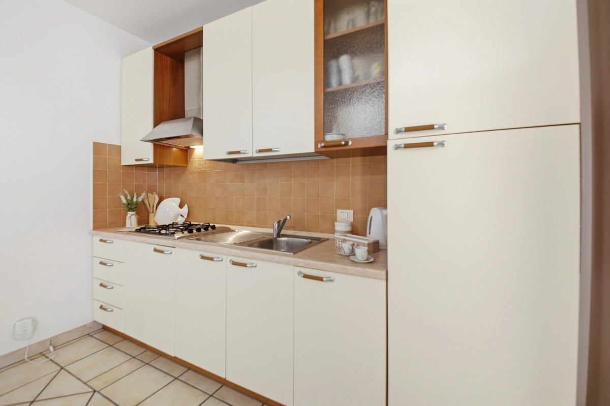 L'angolo cottura è integrato in modo moderno e discreto nel soggiorno. Presenta mobili bianchi e un pratico schienale piastrellato color biscotto. È completamente attrezzato con piano cottura, cappa aspirante e ampio spazio contenitivo, permettendo di preparare colazioni e cene in autonomia.