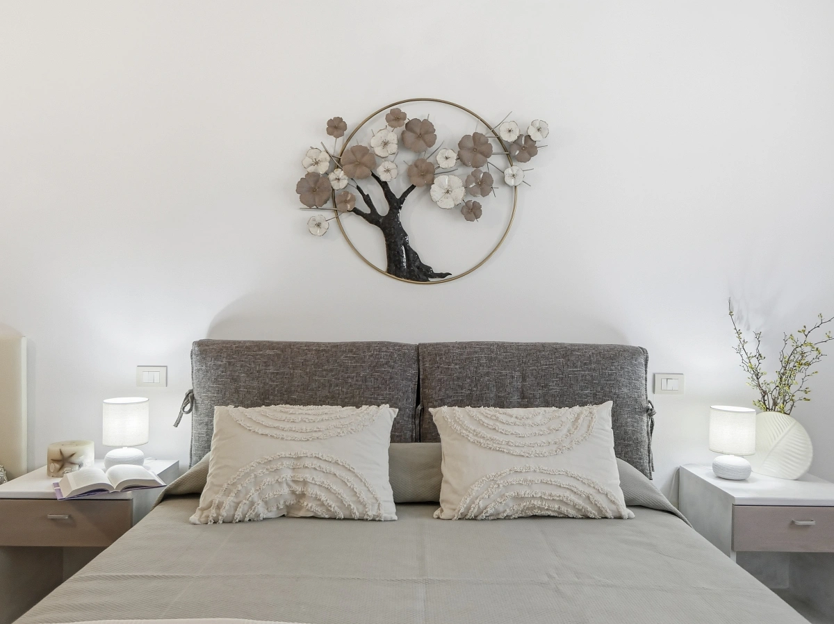 Style Details: The light-coloured walls, terracotta floors and nature-themed furnishings (floral motifs and stylised trees) create a serene and relaxing atmosphere.