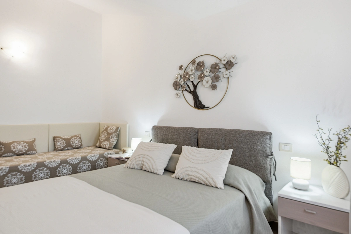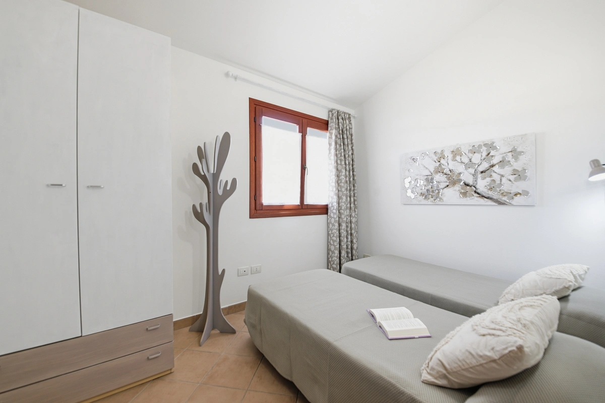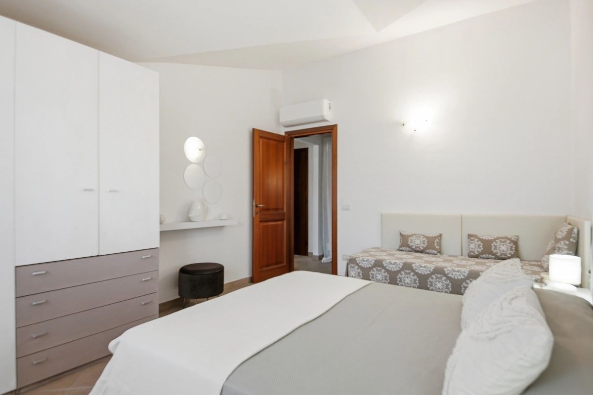Master Bedroom: Spacious and bright, decorated in neutral, natural colours. It features a comfortable double bed and a single bed additional. The arched windows add a touch of Sardinian charm.