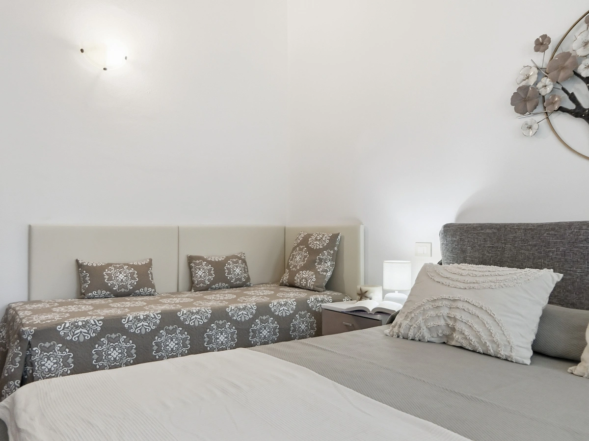 The flat is ideal for comfortably accommodating up to 6/7 persons. The layout is as follows: one double bedroom with a double bed and an additional single bed; one small bedroom with two single beds; and a double sofa bed in the living room.