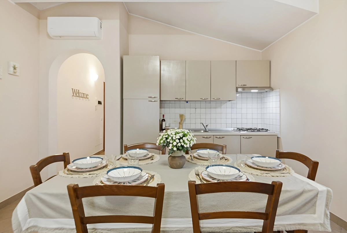Outdoor Space: The terrace is furnished with a dining table and chairs, ideal for enjoying every moment of the day outdoors.