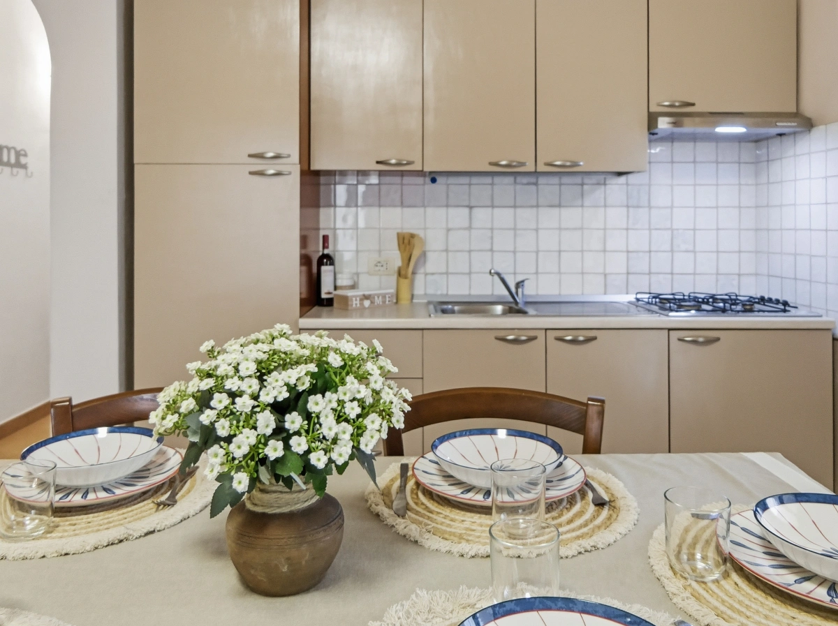 Fitted Kitchen: The kitchenette is fully equipped and features modern, colourful cabinets. beige/taupe with clean finishes. It is functional for preparing complete meals.