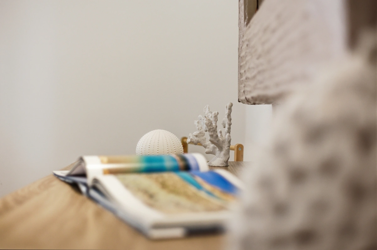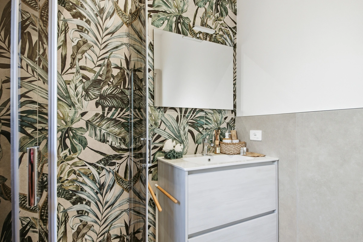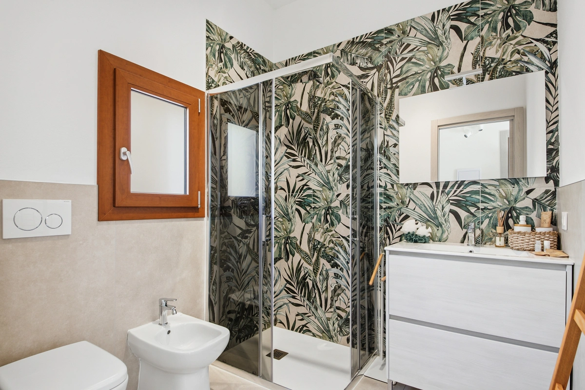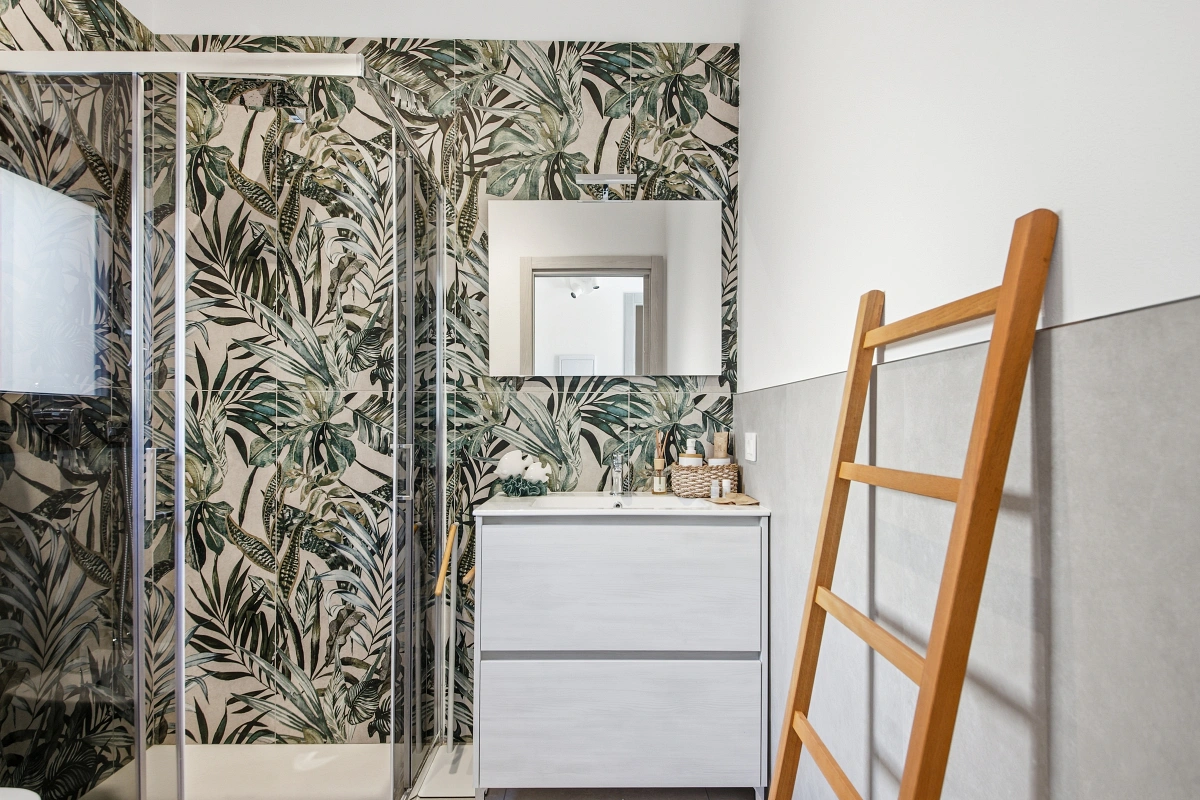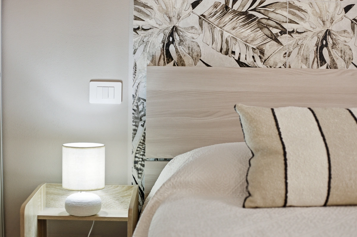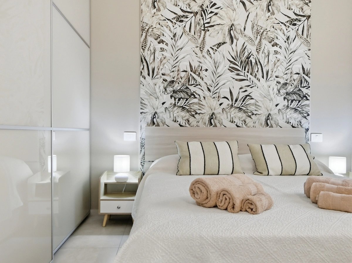• Double Room: The bedroom offers a refined and relaxing ambience, with an accent wall featuring a tropical/botanical motif in neutral tones and light wood furnishings, ensuring maximum tranquillity.