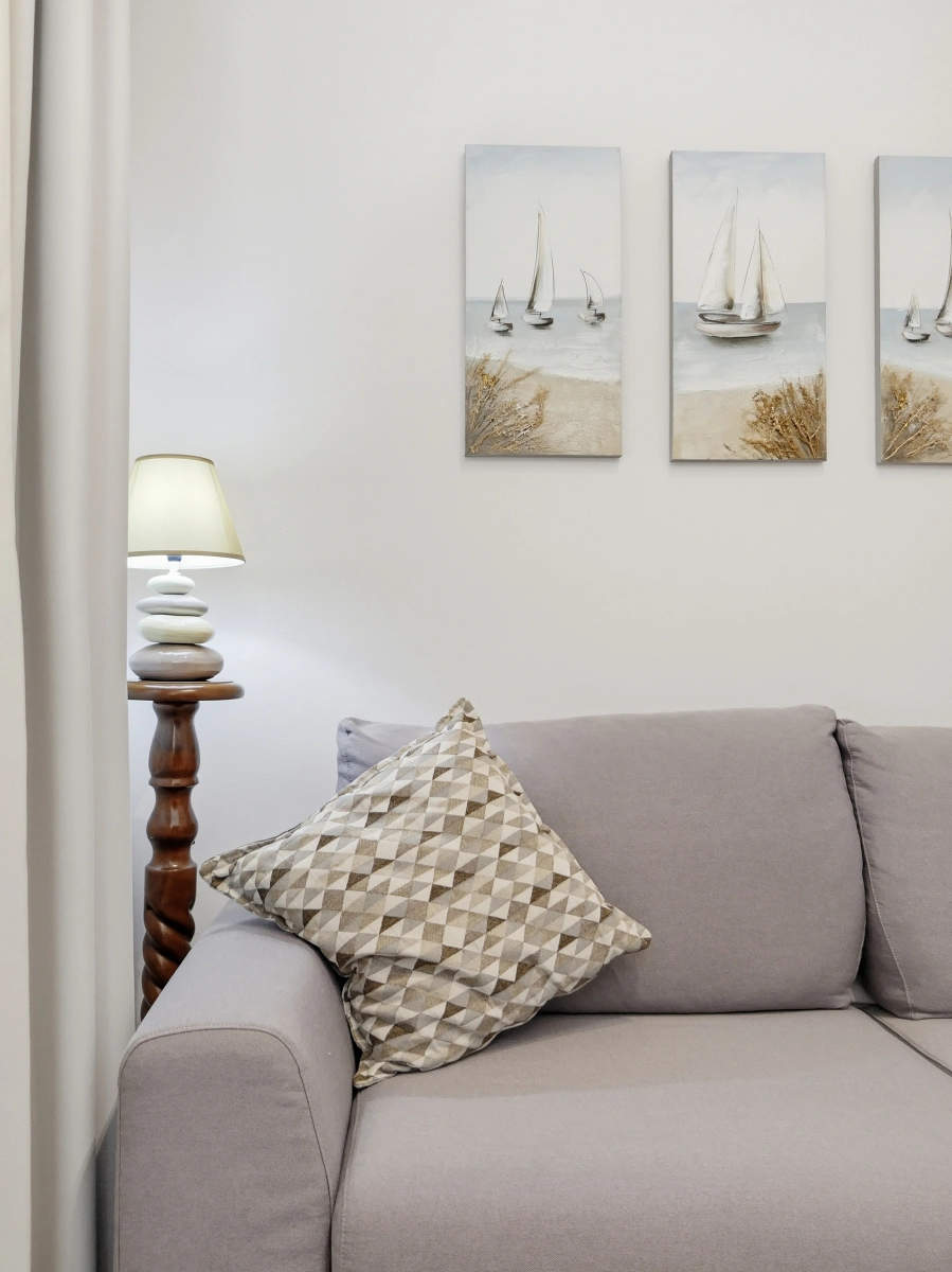 • Open Living Area: The heart of the flat is the living room, which incorporates a modern and functional kitchenette. The living area houses a comfortable separate sofa bed, ideal for two additional guests.